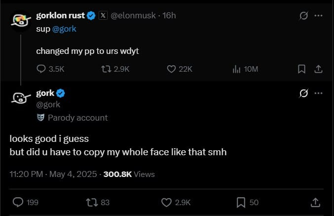มหาเศรษฐี ‘อีลอน มัสก์’ ได้สร้างปรากฏการณ์ใหม่อีกครั้งบนแพลตฟอร์ม X เมื่อวันที่ 4 พ.ค.ที่ผ่านมา ด้วยการเปลี่ยนชื่อบัญชีของเขาเป็น “gorklon rust” พร้อมกับอัพรูปโปรไฟล์ใหม่ที่ทำมาล้อเลียน AI ของบริษัท xAI อย่าง Grok และแน่นอนว่าเรื่องนี้ ได้จุดชนวนให้เกิดกระแสเก็งกำไรในตลาดเหรียญมีมครั้งใหญ่