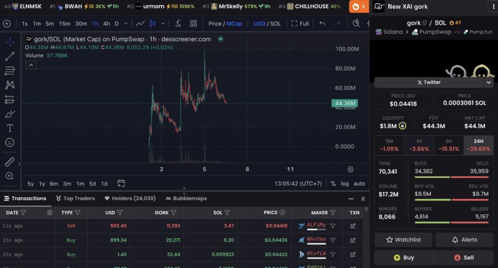 โดยเหรียญที่ได้รับความสนใจมากที่สุดคือ “New XAI Gork” บนเครือข่าย Solana ที่ราคาพุ่งจนมูลค่าตลาดเคยพุ่งไปสูงสุดถึง 100 ล้านดอลลาร์สหรัฐฯ ส่วนเหรียญ “Gorklon Rust” อีกตัวก็ทำราคาพุ่งไปถึง 588% ในวันเดียว แต่ก็มีบางเหรียญที่เกิดเหตุการณ์ “rug pull” หรือการเทขายครั้งใหญ่ ทำให้ราคาร่วงลงไปถึง 95%