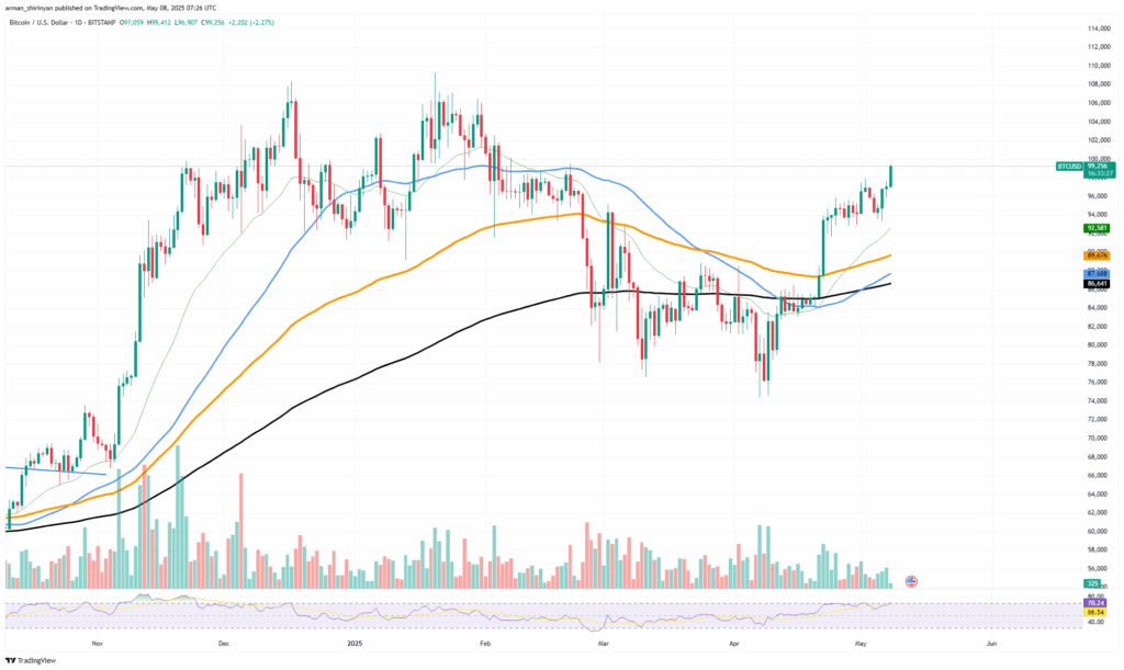 Bitcoin ยังคงอยู่เหนือเส้น Moving Average หลัก ๆ อยู่ (EMA50, EMA 100 และ EMA200) และแท่งเทียนที่วิ่ง breakout ออกมาล่าสุดนั้นเป็นเครื่องยืนยันโครงสร้างขาขึ้นที่แข็งแกร่งบนกราฟในรอบวันได้เป็นอย่างดี แม้ว่าจะยังไม่มีสัญญาณแสดงถึงการชะลอตัวของกราฟ Bitcoin แต่ RSI ของมันยังอยู่รอบ ๆ 70 อาจทำให้เกิดความผันผวนในระยะสั้น การครอบงำตลาดที่เพิ่มขึ้นส่งผลโดยตรงต่อการกระทำรุนแรงนี้
