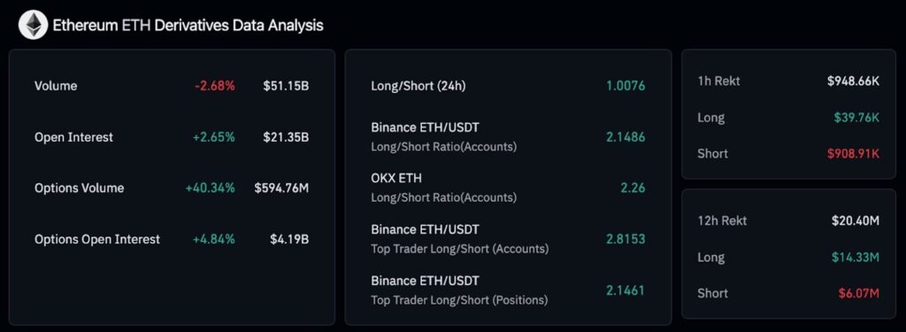 - Open Interest ของ Ethereum พุ่งสูงขึ้น 2.65% เป็นประมาณ 2.14 หมื่นล้านดอลลาร์ ในช่วง 24 ชั่วโมงที่ผ่านมา