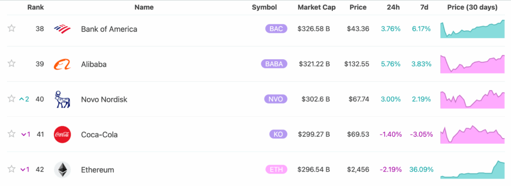เมื่อเทียบกับ Coca-Cola ที่มีมูลค่าตลาดราว 3.035 แสนล้านดอลลาร์ และ Alibaba ที่ประมาณ 3.037 แสนล้านดอลลาร์ ตามข้อมูลจาก 8marketcap จะเห็นว่า Ethereum เคยแซงขึ้นไปเป็นสินทรัพย์ใหญ่อันดับที่ 39 ของโลกอยู่ช่วงเวลาหนึ่ง แม้ล่าสุดมูลค่าตลาดของ Ethereum จะถอยกลับลงมาอยู่ที่อันดับ 42 แล้วก็ตาม