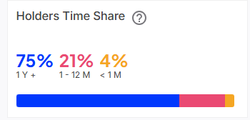 จากสถิติ ‘Holder Time Share’ ยังเผยว่าประมาณ 75% ของผู้ถือ Bitcoin ถือเหรียญไว้เกิน 1 ปี ขณะที่อีก 21% ถือระหว่าง 1-12 เดือน และเพียง 4% เท่านั้นที่เพิ่งเข้ามาถือในระยะไม่ถึงเดือน