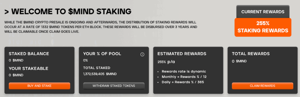 การ Staking สำหรับผู้ถือโทเคน $MIND เปิดให้ใช้งานแล้ว พร้อมผลตอบแทนสูงถึง 255% APY โดยมีนักลงทุนระยะยาว แห่ฝากเหรียญกว่า 1.4 พันล้าน $MIND เข้าโปรโตคอลเรียบร้อยแล้ว เหลือเวลาอีกเพียง 21 วันก่อนที่ $MIND จะเปิดตัวบนกระดานเทรดอย่างเป็นทางการ