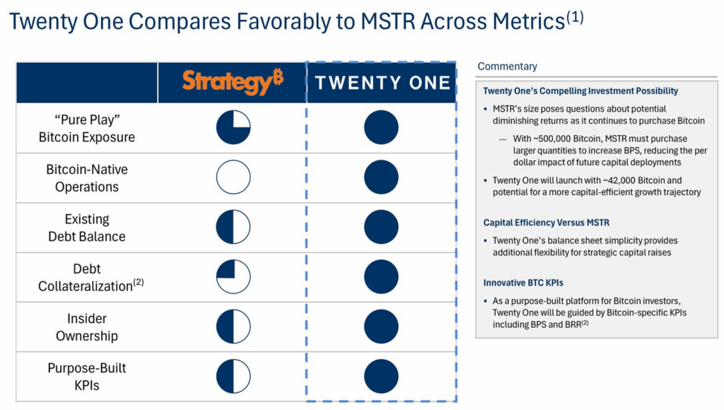 Twenty One เคยระบุไว้ในการนำเสนอแก่ ก.ล.ต. เมื่อเดือนเมษายนว่า บริษัทตั้งเป้าที่จะแซงหน้า Strategy ของ Michael Saylor และเป็นทางเลือกหลักสำหรับนักลงทุนที่ต้องการเข้าถึง Bitcoin อย่างมีประสิทธิภาพ โดยเน้นเป็นบริษัทที่ดำเนินงานโดยใช้ Bitcoin เป็นแกนหลักจริง ๆ และมีความยืดหยุ่นในการระดมทุนมากกว่า
