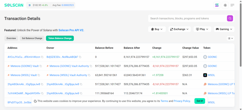 กระเป๋าเงินที่ขึ้นต้นด้วย “BdjSZ” ได้เข้าซื้อเหรียญ GOONC จำนวนกว่า 8 ล้านโทเคน ด้วยเงินเพียง 1.97 SOL หรือราว 332 ดอลลาร์ในช่วงเริ่มต้น หลังจากนั้นไม่นาน เจ้าของกระเป๋าก็ทยอยขายเหรียญออกทีละล็อต ล็อกกำไรตั้งแต่ล็อตละ $1,600 ถึง $3,500 รวมแล้วเกือบ 190,000 ดอลลาร์