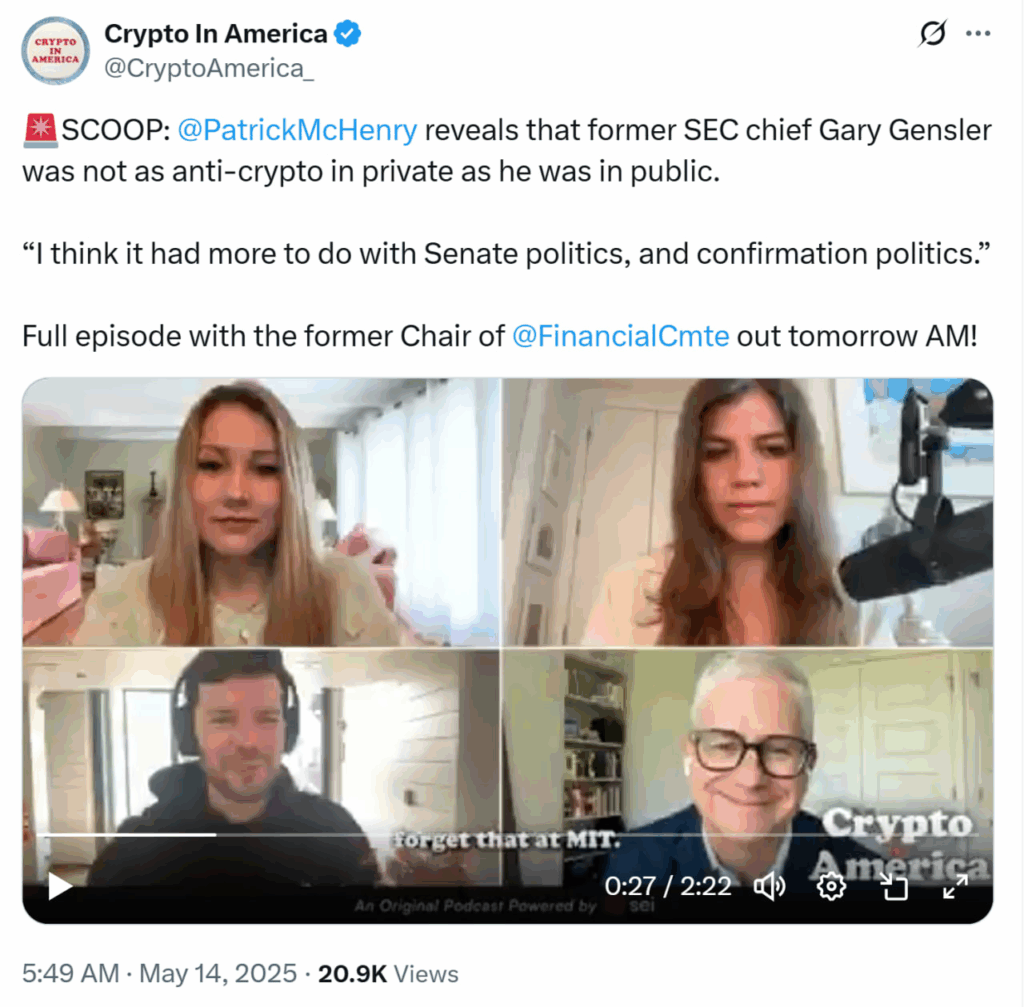 ในการให้สัมภาษณ์ผ่านพอดแคสต์ Crypto in America เมื่อวันที่ 13 พฤษภาคมที่ผ่านมา Patrick McHenry เปิดเผยว่า ในการสนทนาเป็นการส่วนตัวกับ Gary Gensler อดีตประธาน ก.ล.ต. สหรัฐฯ เขาพบว่า Gensler มีท่าทีเปิดกว้างและแสดงมุมมองที่ลึกซึ้งต่อสินทรัพย์ดิจิทัลมากกว่าที่เคยแสดงต่อสาธารณชน