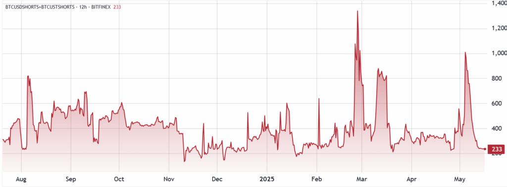จำนวนมาร์จิ้นในการเปิด long บน Bitfinex ลดลงจาก 80,387 BTC เหลือ 65,889 BTC ระหว่างวันที่ 16 เมษายนถึง 16 พฤษภาคม การเปลี่ยนแปลงนี้ถือเป็นการกลับทิศจากความต้องการมาร์จิ้นขาขึ้นที่แข็งแกร่งซึ่งเห็นได้ระหว่างกลางเดือนกุมภาพันธ์ถึงกลางเดือนมีนาคม ซึ่งเป็นช่วงที่ราคา Bitcoin ลดลงจาก $97,600 เหลือ $82,500 การลดลงของจำนวนมาร์จิ้นที่เปิด long ในปัจจุบันน่าจะเป็นสัญญาณของการเทขายทำกำไรที่ถือได้ว่าเป็นเรื่องปกติมากกว่าการที่มันจะเป็นเรื่องของเปลี่ยนเป็นโมเมนตัมไปสู่ขาลง