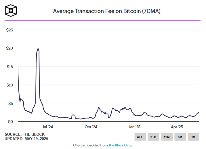 และในขณะที่ราคาขยับขึ้น ค่าธรรมเนียมเฉลี่ยต่อธุรกรรมในช่วง 7 วันได้เพิ่มขึ้นราว 1 ดอลลาร์ นับตั้งแต่ต้นเดือนพฤษภาคม และล่าสุดอยู่ที่ 2.40 ดอลลาร์ ซึ่งถือเป็นระดับสูงสุดของปี 2025 ตามข้อมูลของ The Block แสดงให้เห็นถึงแรงกดดันของผู้ใช้งานที่ต้องแข่งขันกันเพื่อให้ธุรกรรมของตนถูกบันทึกลงในบล็อก