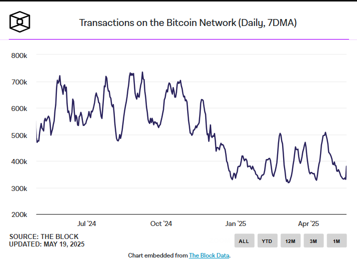 แม้ค่าธรรมเนียมจะเพิ่มขึ้น แต่จำนวนธุรกรรมเฉลี่ยต่อวันกลับลดลง โดยลดลงถึง 35% จากระดับสูงสุดที่ 507,000 ธุรกรรม ก่อนที่จะลดลงเหลือเพียง 330,000 ธุรกรรมในขณะนี้ ปรากฏการณ์นี้อาจบ่งบอกถึงการใช้งานที่มุ่งเน้นไปที่ธุรกรรมที่มีมูลค่าสูงหรือมีความเร่งด่วนมากกว่า