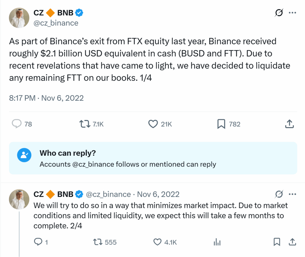 เหตุการณ์นี้ทำให้ Binance ตัดสินใจขาย FTT เพราะมีข้อมูลใหม่ในตลาด และตั้งใจลดผลกระทบที่อาจเกิดขึ้นกับตลาด ซึ่ง Binance ยืนยันว่าไม่ได้มีเจตนาใดๆ ที่จะบั่นทอน FTX โดยอ้างว่าไม่มีหลักฐานในคำฟ้องที่พิสูจน์ได้