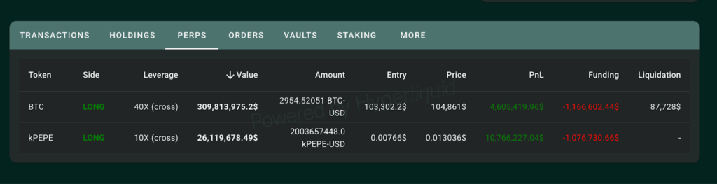 อ้างอิงข้อมูลจาก Hypurrscan พบว่าเจ้ามือรายหนึ่งได้ทำการเปิด Long Position 40X ใน Bitcoin เป็นมูลค่ากว่า $310 ล้าน โดยมีราคาเข้าซื้ออยู่ที่ $103,302 ส่งผลให้ในขณะที่รายงานเจ้ามือรายนี้มีกำไรที่ยังไม่เกิดขึ้นมูลค่ากว่า 4.7 ล้านดอลลาร์ แต่กลับกันหากราคาของ Bitcoin มีปรับตัวลงมาต่ำกว่า $87,728 จะส่งผลให้เงินจำนวนมหาศาลนี้หายวับไปในทันที