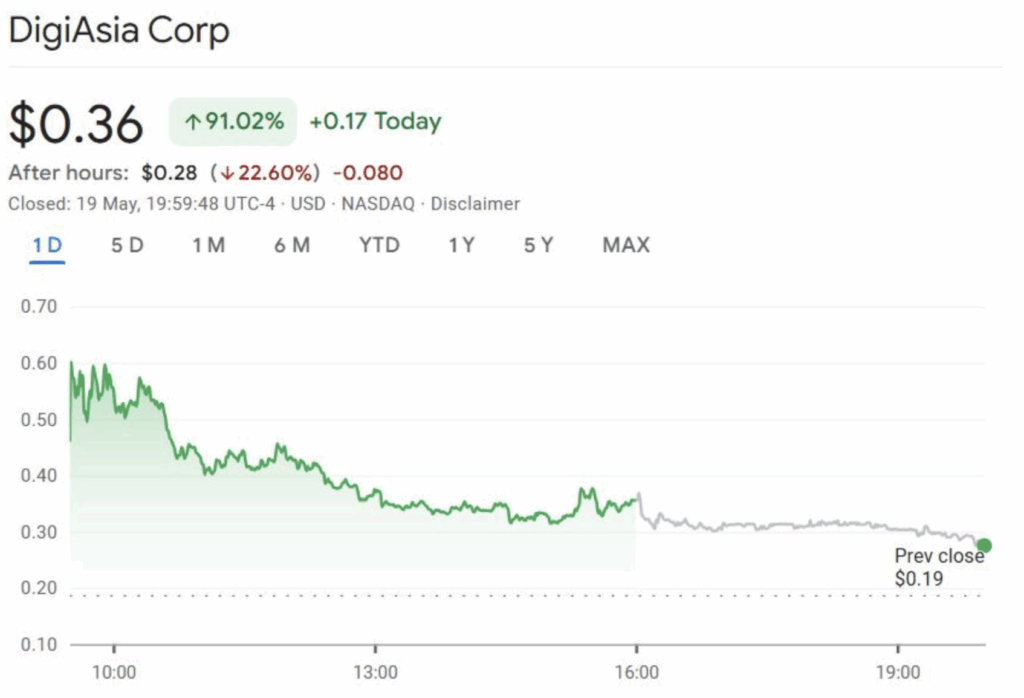DigiAsia Corp. บริษัทฟินเทคจากอินโดนีเซียที่จดทะเบียนในตลาด Nasdaq ราคาหุ้นพุ่งขึ้นเกือบสองเท่า หรือกว่า 90% ในการซื้อขายเมื่อวันที่ 19 พ.ค. ที่ผ่านมา หลังบริษัทประกาศแผนระดมทุน 100 ล้านดอลลาร์ เพื่อใช้เป็นเงินทุนเริ่มต้นในการเข้าซื้อ Bitcoin ซึ่งเป็นส่วนหนึ่งของกลยุทธ์จัดตั้ง “ทุนสำรอง Bitcoin” และจะนำกำไรสุทธิสูงสุดถึง 50% ไปลงทุนใน BTC อย่างต่อเนื่อง
