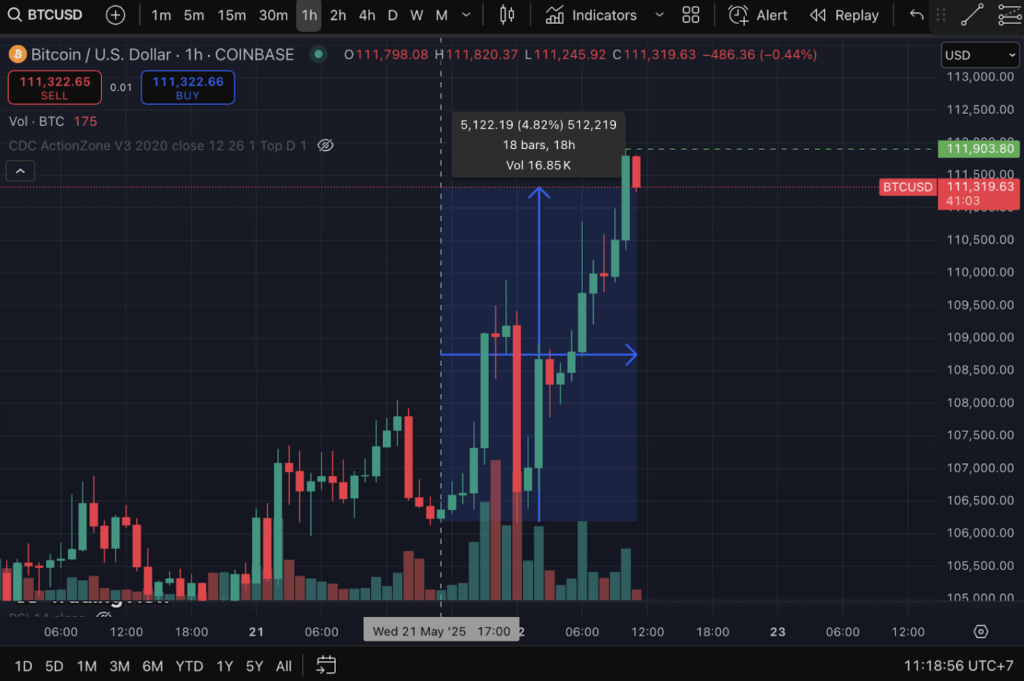 แต่ทว่าหลังจากนั้นไม่นาน ราคา Bitcoin ก็ดูอยากจะท้าทายทฤษฏีความเชื่อของคุณพิชัย จาวลา เนื่องจากราคา Bitcoin ในช่วงกลางดึกของเมื่อวานนี้ กลับพุ่งขึ้นอย่างรุนแรงจนกลับไปแตะจุดสูงสุดตลอดกาล (ATH) เดิมที่ประมาณ 109,000 ดอลลาร์ ได้อีกครั้ง ก่อนที่ช่วงเช้าของวันนี้ (22 พ.ค.) ราคาจะทะยานขึ้นทำลาย ATH เดิมได้อย่างไร้ข้อกังขา ตามข้อมูลจาก TradingVeiw