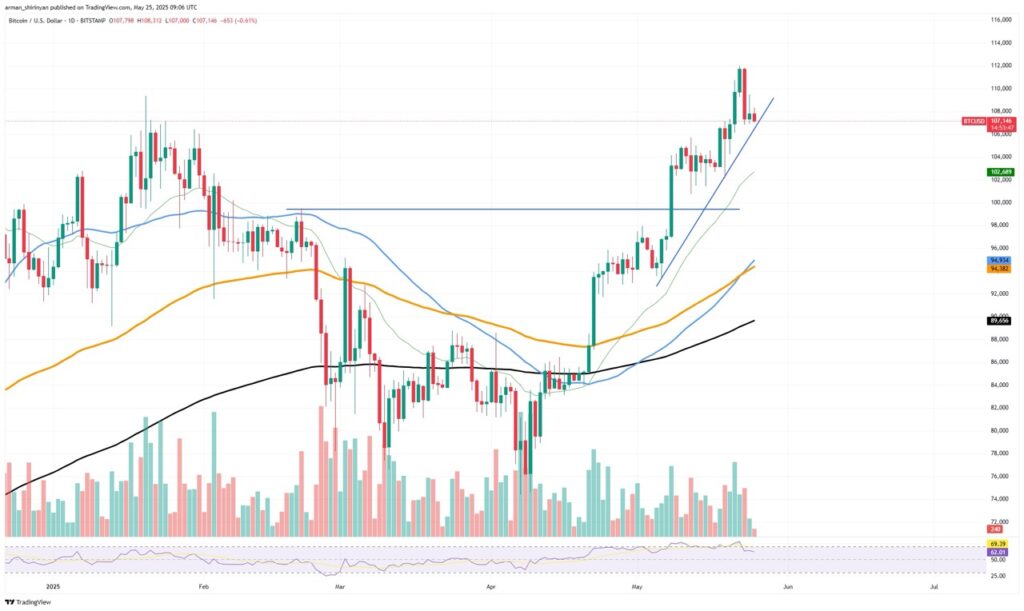 หลายคนคาดหวังว่า Golden Cross ล่าสุดของ Bitcoin จะทำให้ราคาพุ่งอย่างรุนแรง แต่ราคากลับย่อตัวลงจากจุดสูงสุดที่ประมาณ 112,000 ดอลลาร์ ลงมาทดสอบแนวรับที่ 107,000 ดอลลาร์ แม้การย่อตัวนี้อาจทำให้บางคนกังวล แต่มีเหตุผลที่ชี้ว่านี่เป็นเพียงการปรับฐานตามปกติ