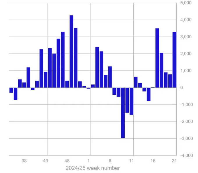 โดย Bitcoin เป็นสินทรัพย์หลักที่ได้รับเงินไหลเข้ามากที่สุดในสัปดาห์ดังกล่าว โดยมียอดรวมถึง 2.9 พันล้านดอลลาร์ คิดเป็นหนึ่งในสี่ของยอดไหลเข้าทั้งหมดของปี 2024 ขณะที่ราคาของ Bitcoin ทะยานเกิน 110,000 ดอลลาร์ในวันที่ 22 พฤษภาคมที่ผ่านมา ทำให้มีนักลงทุนบางส่วนหันไปลงทุนในผลิตภัณฑ์ short-BTC ซึ่งมียอดไหลเข้าสูงถึง 12.7 ล้านดอลลาร์ มากที่สุดนับตั้งแต่เดือนธันวาคม 2024
