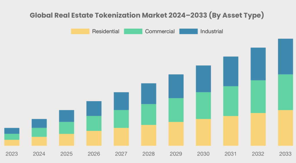 ตามรายงานจาก Custom Market Insights ตลาดการโทเคนอสังหาริมทรัพย์ทั่วโลกอาจมีมูลค่าทะลุ 19,400 ล้านดอลลาร์ภายในปี 2033 เติบโตเฉลี่ย 21% ต่อปี โดยมีทั้งอสังหาฯ แบบอยู่อาศัย เชิงพาณิชย์ และอุตสาหกรรม ที่จะเข้ามามีบทบาทในตลาดนี้