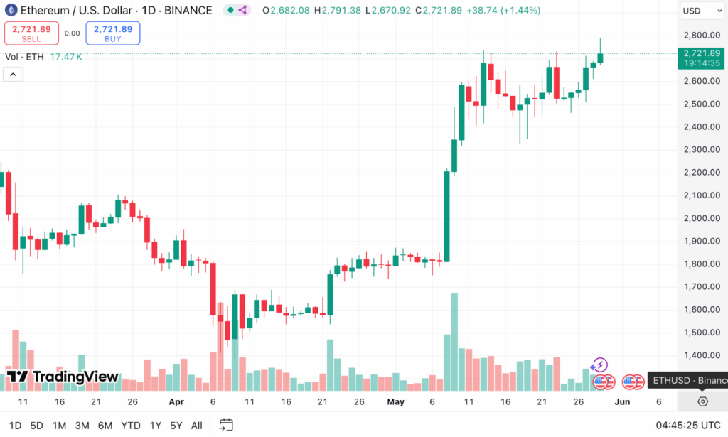 อ้างอิงจากกราฟ ETH/ USDT บนเว็บไซต์ TradingView โดยใช้ข้อมูลจากกระดานเทรด Binance จะพบว่าราคา Ethereum ได้เริ่มมีการปรับตัวเพิ่มขึ้นอย่างชัดเจนตั้งแต่ช่วงเวลาประมาณเที่ยงคืนของวันที่ 29 พฤษภาคม (เวลาประเทศไทย) โดยราคาได้ไต่ระดับจากบริเวณประมาณ $2,600 และพุ่งขึ้นอย่างต่อเนื่องจนทะลุแนวต้านสำคัญบริเวณ $2,700 ได้สำเร็จในช่วงเวลาประมาณ 07:30 น.