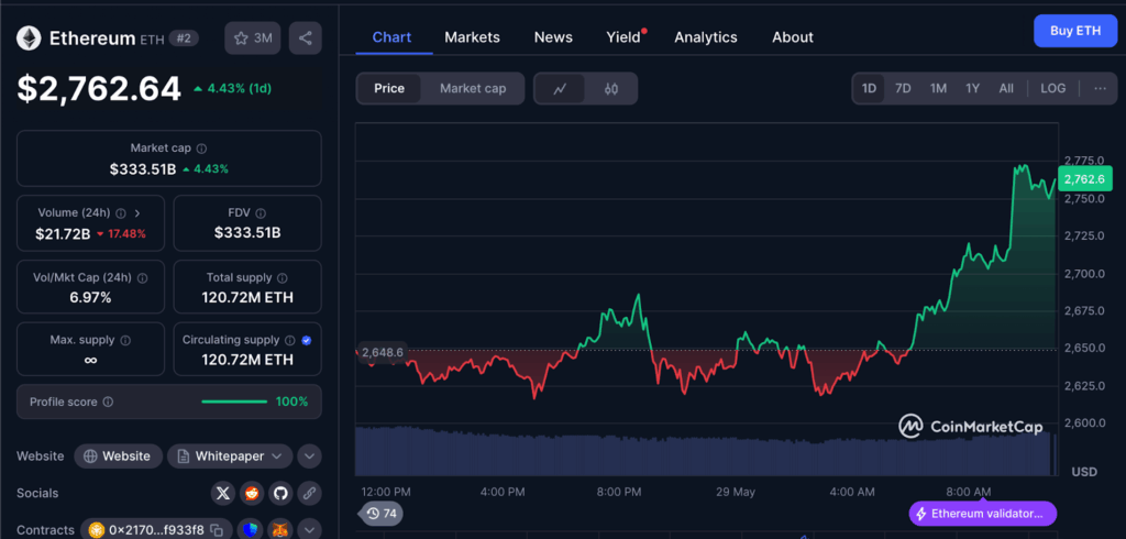 ในขณะที่เขียนรายงาน ราคา Ethereum มีการซื้อขายอยู่ที่ประมาณ 2,762 ดอลลาร์ เพิ่มขึ้นกว่า 4.43% ภายใน 24 ชั่วโมงที่ผ่านมา ซึ่งบ่งชี้ถึงแรงเก็งกำไรและความเชื่อมั่นที่กลับมาสู่เหรียญนี้อีกครั้ง
