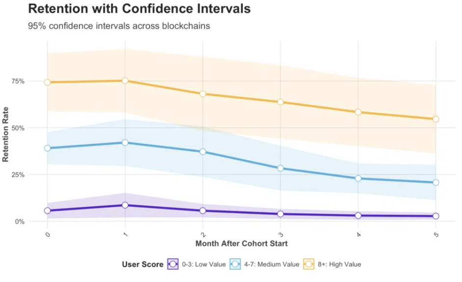 แม้ภาพรวมจะดูไม่ดีนัก แต่ก็ยังมีบางเครือข่ายที่ทำผลงานได้ดี เช่น Ethereum และ Avalanche ที่สามารถรักษาผู้ใช้งานระดับสูงไว้ได้ดีที่สุด โดยมียอดผู้ใช้งานที่ยังใช้งานอยู่ หลังผ่านไป 6 เดือน อยู่ที่ 35–38% ในทางกลับกัน Solana ซึ่งเป็นหนึ่งในเครือข่ายขนาดใหญ่ กลับมีอัตราการรักษาผู้ใช้ต่ำกว่าคาดอย่างเห็นได้ชัด