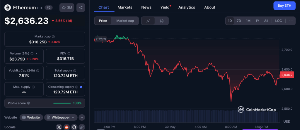 ในขณะที่รายงาน ราคา Ethereum กำลังซื้อขายอยู่ที่ 2,636 ดอลลาร์ ลดลง 3.55% ภายใน 24 ชั่วโมง อ้างอิงข้อมูลจาก coinmarketcap