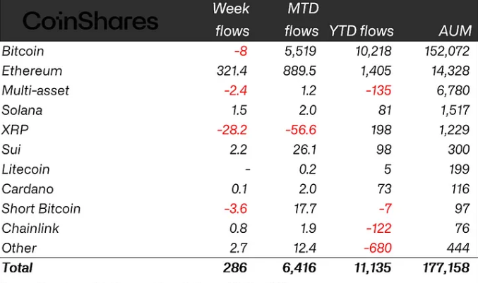 สิ่งที่น่าสนใจคือ Ethereum กลายเป็นดาวเด่นของสัปดาห์ โดยผลิตภัณฑ์ ETP ของ Ethereum มีเงินไหลเข้าสูงถึง 321 ล้านดอลลาร์ ซึ่งเป็นระดับที่สูงที่สุดนับตั้งแต่ปลายเดือนธันวาคม 2024 สะท้อนให้เห็นถึงความเชื่อมั่นที่ฟื้นตัวอย่างชัดเจน”