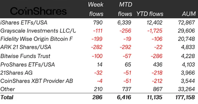 ทางด้านฝั่งผู้จัดการกองทุน BlackRock ยังคงครองแชมป์เงินไหลเข้าสูงสุด โดย iShares ETF มีเงินไหลเข้าสุทธิ 790 ล้านดอลลาร์ในสัปดาห์เดียว ส่งผลให้ยอดรวมตั้งแต่ต้นปีแตะ 12.4 พันล้านดอลลาร์ แม้ว่า AUM ของ iShares จะลดลงจาก 74.8 พันล้านดอลลาร์เหลือ 72.9 พันล้านดอลลาร์