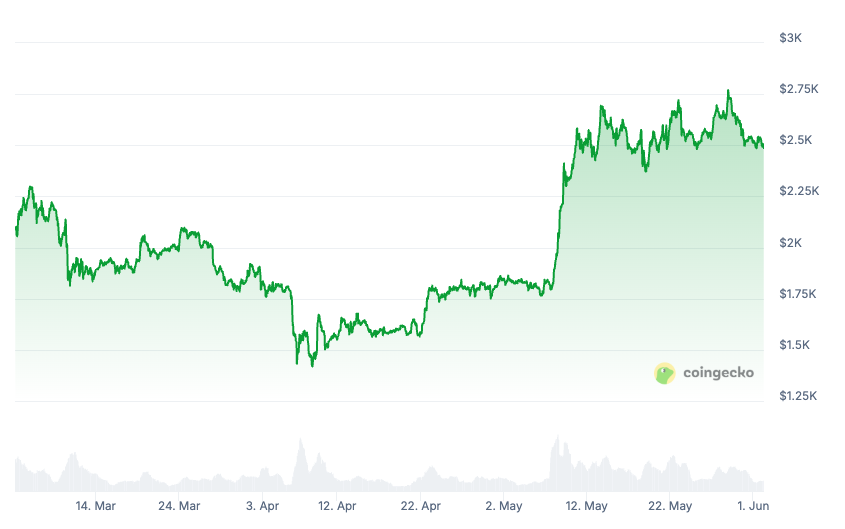ซึ่งปัจจัยหลักที่ทำให้ Ethereum มาแรงในช่วงนี้ มาจากการพัฒนาเครือข่ายและตลาดฟิวเจอร์สที่ยังคงแข็งแกร่ง หลังจากก่อนหน้านี้ถูกมองว่า “เหมือนเหรียญ Meme” จนหลายบริษัทเทรดหยุดรองรับไปเมื่อช่วงต้นเดือนพฤษภาคม โดยราคาล่าสุดของ Ethereum อยู่ที่ 2,486 ดอลลาร์ แม้จะลดลงจาก 2,771 ดอลลาร์ในวันที่ 28 พฤษภาคม แต่ก็ยังเพิ่มขึ้นถึง 36% ในช่วง 30 วันที่ผ่านมา