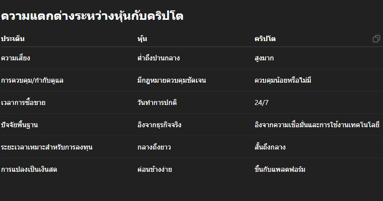 แต่ถ้าคุณเป็นสายที่รับความเสี่ยงได้ ชอบความตื่นเต้น และมีเวลาติดตามข่าวสารหรือเทรนด์ของโลกอยู่เสมอ คริปโทฯก็เป็นอีกทางเลือกที่น่าสนใจ อย่างไรก็ตาม คุณต้องศึกษาข้อมูลให้เพียงพอ และเข้าใจลักษณะของตลาดคริปโทฯอย่างลึกซึ้งก่อนเริ่มลงทุน เพราะความผันผวนสูงอาจนำไปสู่การขาดทุนได้ หากตัดสินใจด้วยความประมาทไม่ว่าคุณจะเลือกลงทุนในหุ้นหรือคริปโทฯ สิ่งสำคัญที่สุดคือ อย่าลงทุนตามคนอื่น แต่ควรศึกษาข้อมูลด้วยตนเองให้รอบด้าน วางแผนอย่างรอบคอบ และลงทุนอย่างมีสติ เพราะทุกการลงทุนมีความเสี่ยง
