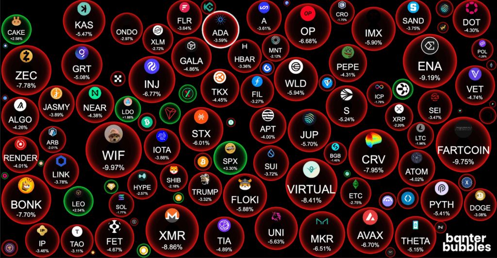 ขณะเดียวกัน ในส่วนของ Altcoins นั้นได้รับผลกระทบที่รุนแรงกว่า Bitcoin เป็นอย่างมาก ซึ่งจะเห็นได้ว่าส่วนใหญ่นั้นทำราคาปรับลดลงมาตามพี่ใหญ่อย่าง Bitcoin เช่น WIF ที่ร่วงกว่า -9.97% เช่นเดียวกันกับ Fartcoin ที่ร่วงไปเกือบ 10% อย่างไรก็ตามไม่ใช่ว่า Altcoins ทุกตัวจะร่วงตามกัน เพราะในกรณีอย่าง SPX หรือ CAKE กลับพุ่งขึ้นมาสวนตลาดในวันนี้ได้อย่างเหนือความคาดหมาย ตามข้อมูลของ Banterbubbles