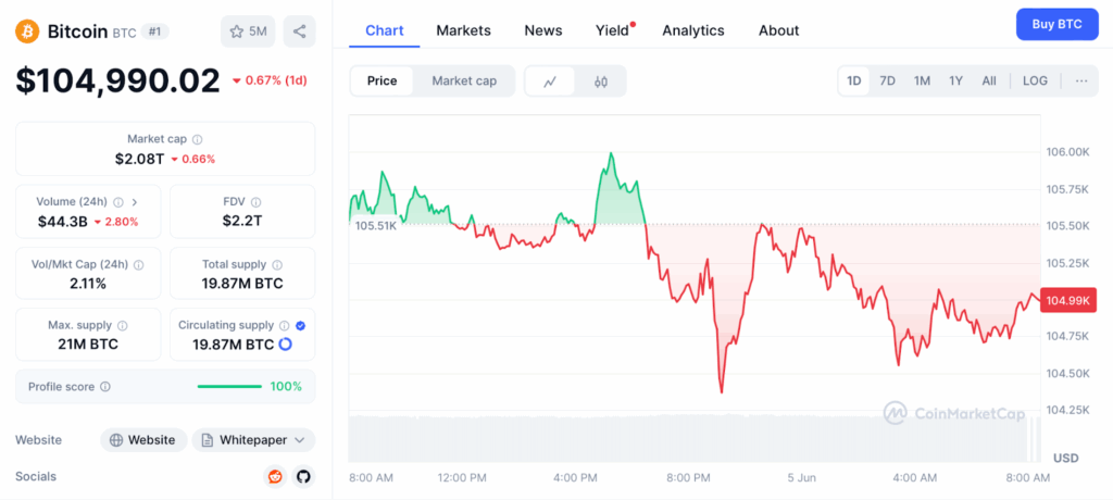 อ้างอิงตามข้อมูลจาก CoinMarketCap ราคาบิทคอยน์ยังคงทรงตัวอยู่ที่ระดับราคา 105,000 ดอลลาร์ ในขณะที่รายงาน โดยในช่วง 24 ชั่วโมงที่ผ่านมา ได้มีการปรับตัวลงประมาณ 0.50% และทำจุดต่ำสุดอยู่ที่ $104,179