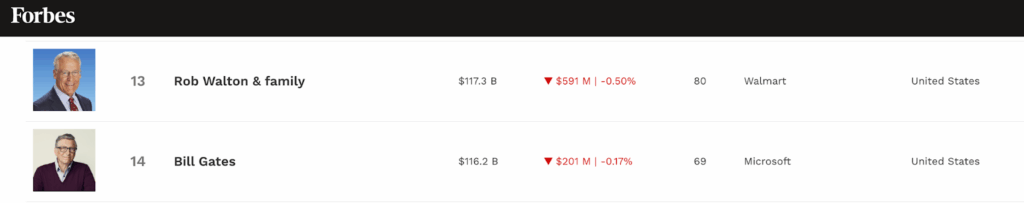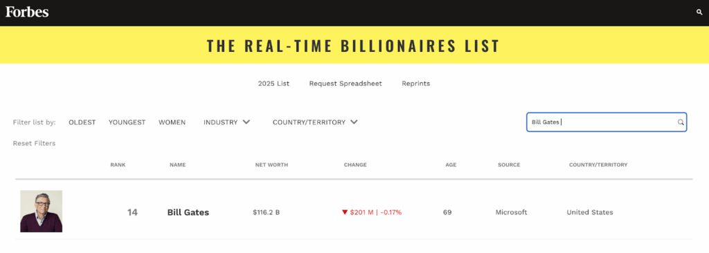Bill Gates ซึ่งมีมูลค่าทรัพย์สินสุทธิ 116,200 ล้านดอลลาร์ ถือเป็นบุคคลที่รวยที่สุดอันดับที่ 14 ของโลก