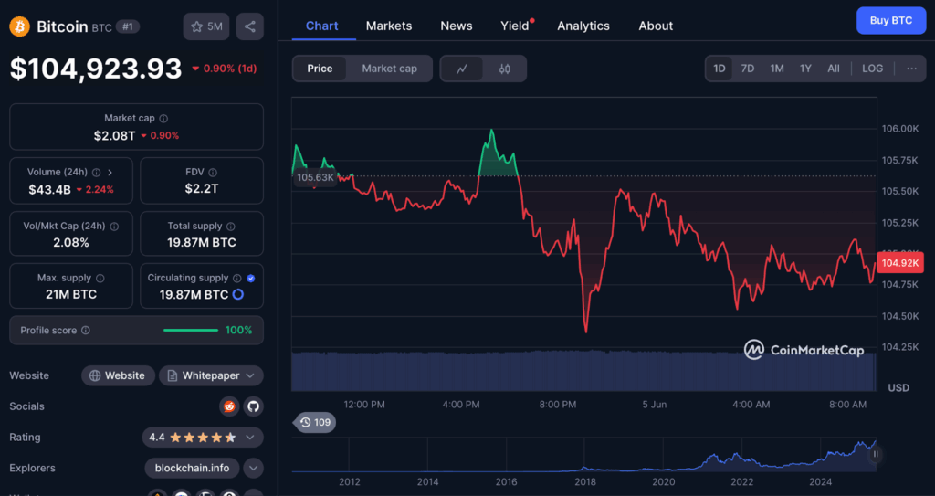 ในขณะที่รายงาน ราคา Bitcoin กำลังซื้อขายอยู่ที่ 104,923 ดอลลาร์ ลดลง 0.90% ภายใน 24 ชั่วโมง อ้างอิงข้อมูลจาก coinmarketcap