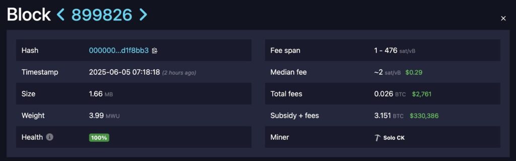 ในยุคที่การขุด Bitcoin ส่วนใหญ่กลายเป็นเรื่องของศูนย์รวมอำนาจ ผ่าน Pool ขนาดมหึมาที่รวม Hashrate จากทั่วโลก นักขุดรายย่อยแทบจะหมดโอกาสได้กลิ่นรางวัลแบบเต็มไม้เต็มมือ แต่มันก็ยังมีปาฏิหาริย์เกิดขึ้นในวันที่ 5 มิถุนายน 2025 เวลา 06:18:18 UTC เมื่อมีนักขุดสาย Solo รายหนึ่งขุดเจอบล็อก หมายเลข 899,826 กวาดรางวัลไปคนเดียวเต็ม ๆ กว่า 3.151 BTC หรือคิดเป็นเงินไทยก็ประมาณ 10.8 ล้านบาท โดยไม่ต้องแบ่ง Bitcoin ให้ใครทั้งสิ้น