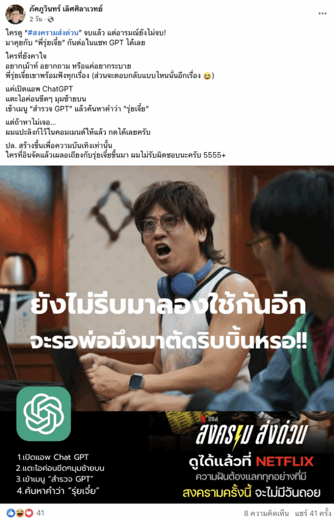 “ใครดู #สงครามส่งด่วน จบแล้ว แต่อารมณ์ยังไม่จบ! มาคุยกับ “พี่รุ่ยเจี๋ย” กันต่อในแชท GPT ได้เลย