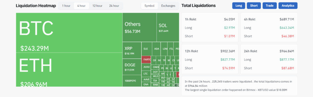 ตามข้อมูลจาก Coinglass พบว่ามีนักเทรดคริปโทฯ กว่า 225,000 รายถูกล้างถูกล้างพอร์ตโดยรวมสูงถึง 964.84 ล้านดอลลาร์ ในช่วง 24 ชั่วโมงที่ผ่านมา โดยส่วนใหญ่เป็น Long Position มากถึง 877.17 ล้านดอลลาร์