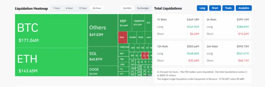 ตลอด 24 ชั่วโมงที่ผ่านมา ตลาดคริปโทเผชิญกับการ ล้างพอร์ต ครั้งใหญ่ มูลค่ารวมกว่า 595 ล้านดอลลาร์ ส่งผลกระทบต่อนักเทรดมากกว่า 156,000 ราย