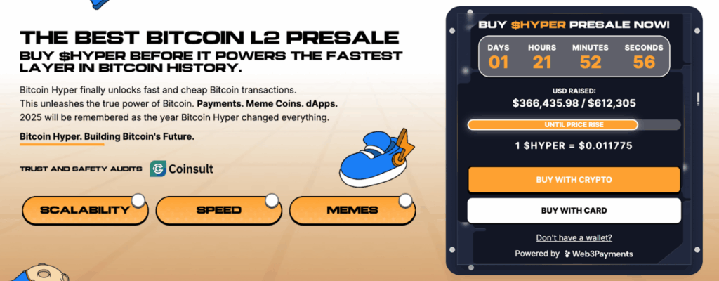 Bitcoin Hyper ($HYPER) โซลูชัน Layer 2 ตัวแรก บนเครือข่าย Bitcoin และเหรียญคริปโตน้องใหม่มาแรง ขณะนี้ได้เปิดระดมทุนในช่วงโปรเจกต์เริ่มต้น อย่างเป็นทางการ พร้อมระดมทุนทะลุ 366,000 ดอลลาร์แล้ว