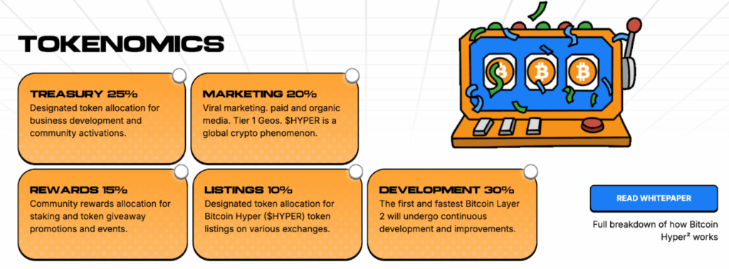 สำหรับการจัดสรรโทเค็นโทมิกส์ของ Bitcoin Hyper แบ่งเป็น 30% ของโทเค็นทั้งหมดจะถูกจัดสรรให้กับการพัฒนา, ส่วน 15% สำหรับเป็นรางวัลชุมชน, 20% สำหรับทำการตลาด, 10% สำหรับการลิสต์เหรียญในเว็บเทรดคริปโต และ 25% จะถูกเก็บไว้ในคลัง (Treasury) สำหรับการพัฒนาธุรกิจ และกิจกรรมของชุมชน