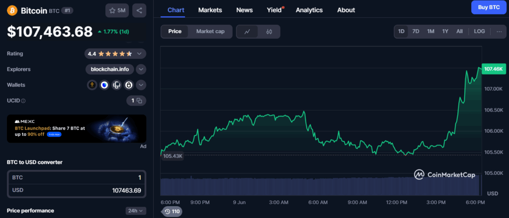 ราคาของ Bitcoin กลับมาร้อนแรงอีกครั้ง หลังราคาเหรียญพุ่งขึ้นแตะระดับ 107,000 ดอลลาร์ อีกครั้ง ซึ่งเป็นการตอกย้ำความแข็งแกร่งของตลาดกระทิงในรอบนี้ ตามข้อมูลจาก CoinMarketCap