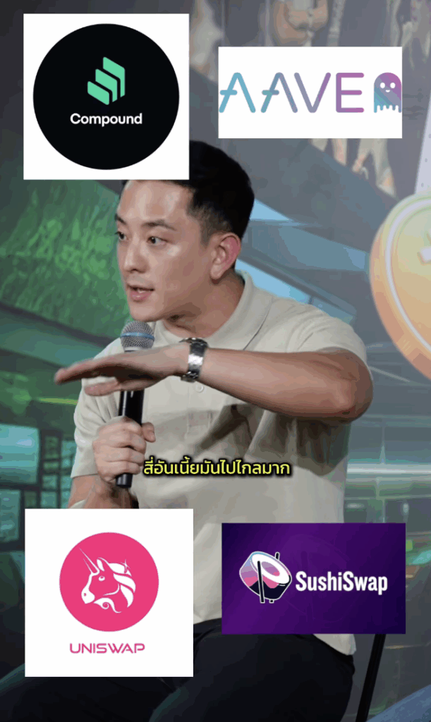 คุณซีเคอธิบายเสริมว่า แล้วทำไมช่วงเวลาปี 2021 ราคา Ethereum ถึงพุ่งขึ้นขนาดนั้น เพราะว่า ethereum เจอ user case ที่สำคัญมากๆ แล้วมีการใช้งานที่แพร่หลายเกิดขึ้นจริง ๆ ซึ่งคือ decentralize finance โดยช่วงเวลาปี 2021 สี่แอปที่มาแรงมาก คือ compound, aave, uniswap, sushiswap สี่แอปนี้มันไปได้ไกลมาก