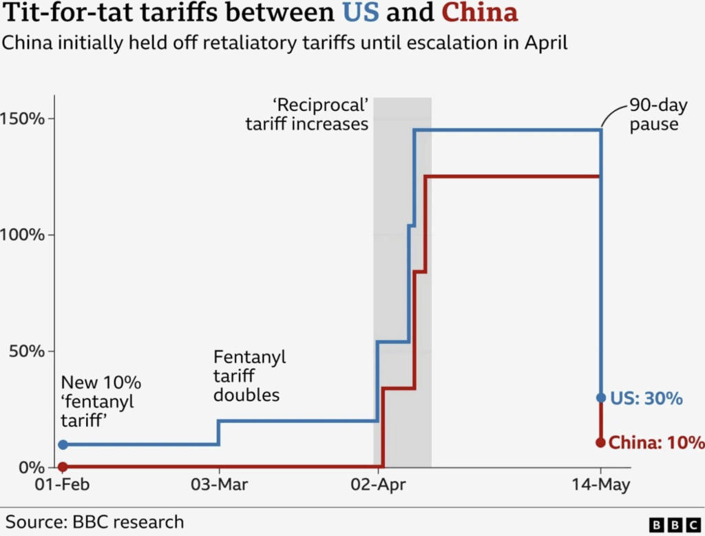 อย่างไรก็ตาม ในเดือนพฤษภาคม การเจรจาที่กรุงเจนีวา ได้นำไปสู่การพักศึกแบบชั่วคราว ซึ่งส่งผลให้สหรัฐฯ ลดภาษีนำเข้าสินค้าจากจีนเหลือเพียง 30% และจีนก็ลดภาษีนำเข้าสินค้าจากสหรัฐฯ เหลือเพียง 10% พร้อมทั้งสัญญาว่า จะยกเลิกข้อจำกัดในการส่งออกแร่หายาก โดยให้เวลาทั้งสองฝ่าย 90 วัน ในการบรรลุข้อตกลงทางการค้า