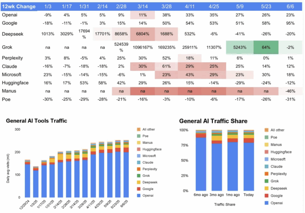 ถ้าอยากให้เห็นภาพชัดเจนขึ้น ลองจินตนาการว่า ChatGPT มีผู้ใช้งานมากกว่าคู่แข่งทั้งหมดอย่าง Google Gemini, DeepSeek, Grok, Perplexity และ Claude รวมกัน มากกว่า 2 เท่าตัว