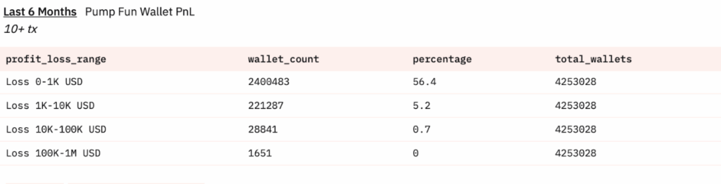 การวิเคราะห์ข้อมูลการซื้อขายของ Pump.fun ล่าสุด แสดงให้เห็นว่า นักเทรดกว่า 60% ขาดทุน โดยกระเป๋าเงินประมาณ 2.4 ล้านใบ ขาดทุนต่ำกว่า 1,000 ดอลลาร์ และกระเป๋าอีกหลายสิบใบ ขาดทุนมากกว่าหกหลัก