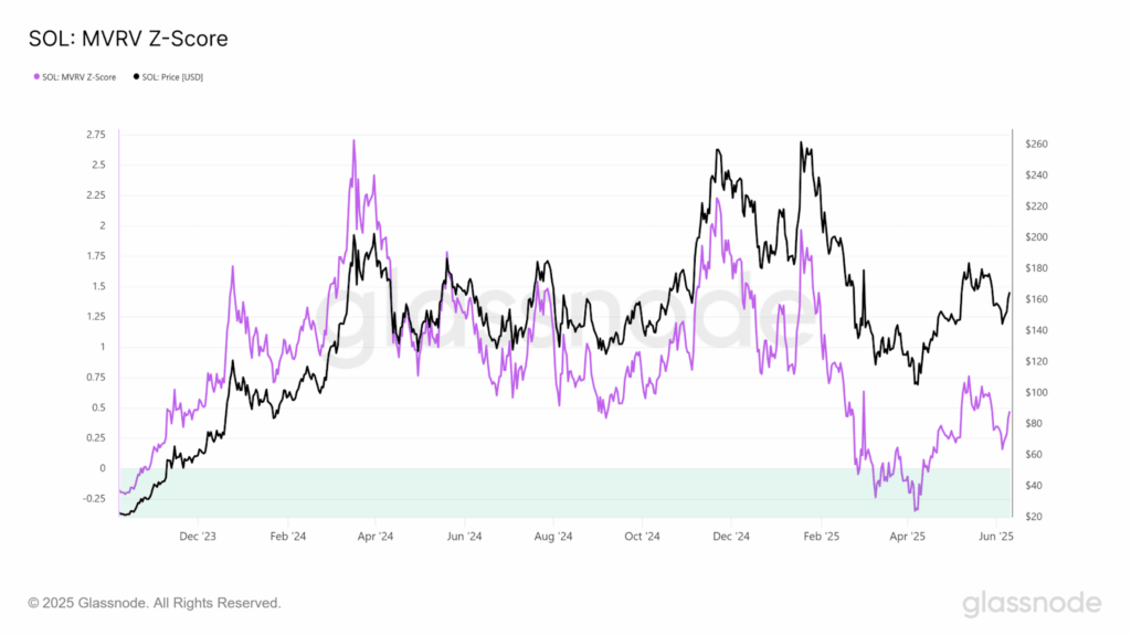 ในด้านของข้อมูล on-chain เครื่องมือวัดมูลค่า MVRV Z-Score ของ Solana อยู่ที่ระดับ 0.47 ซึ่งต่ำกว่าช่วงที่ราคาเคยขึ้นจุดสูงสุดก่อนหน้านี้ที่ $200 และ $295 โดยมากแล้ว จุดพีคในอดีตจะเกิดขึ้นเมื่อค่า MVRV Z-Score พุ่งเกิน 2 แสดงให้เห็นว่า SOL ยังมีพื้นที่เติบโตอีกมากจากราคาปัจจุบันที่ราว $165