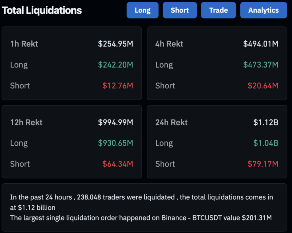 ตามข้อมูลจากเว็บไซต์ Coinglass ระบุว่า ในช่วง 24 ชั่วโมงที่ผ่านมา มีนักเทรดถูกล้างพอร์ตไปแล้วกว่า 238,048 ราย คิดเป็นมูลค่าความเสียหายรวมสูงถึง 1,120 ล้านดอลลาร์สหรัฐฯ