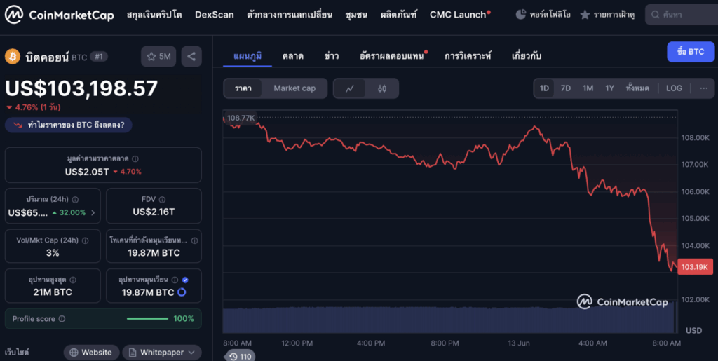 ขณะที่กำลังเขียนรายงานฉบับนี้ ราคา Bitcoin ยังคงอยู่ในแดนลบ โดยมีการซื้อขายกันที่ระดับประมาณ $103,198 คิดเป็นการปรับตัวลดลงถึง 4.76% ภายในช่วง 24 ชั่วโมงที่ผ่านมา ตามข้อมูลล่าสุดจาก CoinMarketCap