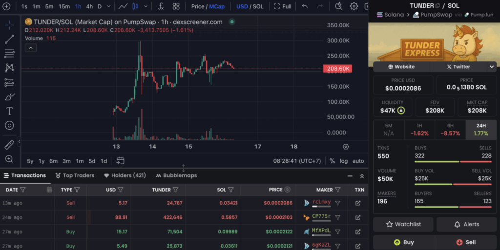 ในขณะที่รายงานเหรียญ $TUNDER มีราคาซื้อขายอยู่ที่ประมาณ $0.0002086 โดยมีมูลค่าตลาด (Market Cap) รวมอยู่ที่ราว ๆ 208,000 ดอลลาร์สหรัฐฯ และมี สภาพคล่อง (Liquidity) อยู่ที่ประมาณ 47,000 ดอลลาร์สหรัฐฯ ซึ่งถือว่าเป็นระดับที่พอมีการซื้อขายหมุนเวียนในระดับหนึ่งสำหรับเหรียญมีมใหม่