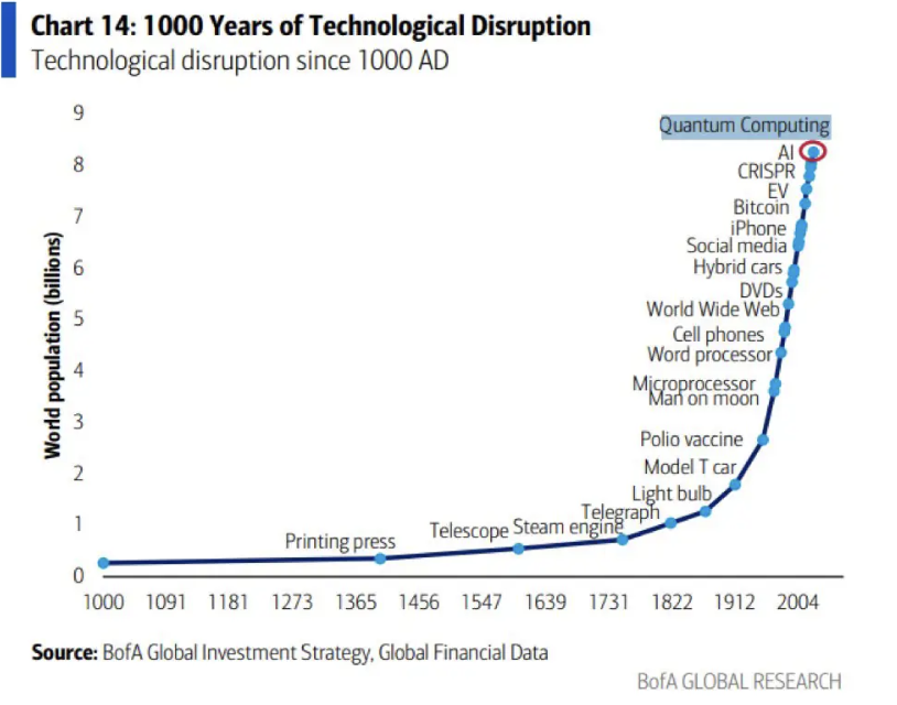 การเปรียบเทียบอันทรงพลังนี้ ปรากฏอยู่ในกราฟแผนภูมิล่าสุด ที่มีชื่อว่า “1000 Years of Technological Disruption” ซึ่งรวบรวมนวัตกรรมสำคัญที่สร้างการเปลี่ยนแปลงมาตลอดหนึ่งพันปี ตั้งแต่ปี ค.ศ. 1000 จนถึงปัจจุบัน