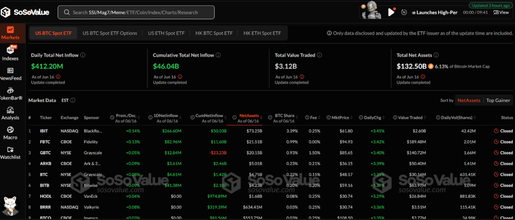ทำให้ปัจจุบัน Bitcoin ETF สหรัฐฯ มีสินทรัพย์รวมสุทธิของกองทุนถึง 132.50 พันล้านดอลลาร์ หรือคิดเป็น 6.13% ของมูลค่าตลาดรวมของ Bitcoin ขณะที่ปริมาณการเทรดในวันที่ 16 มิถุนายน มีมูลค่ารวมกว่า 3.12 พันล้านดอลลาร์ โดยกองทุน iShares Bitcoin Trust (IBIT) ของ BlackRock เป็นผู้นำในตลาด ด้วยเงินไหลเข้า 266.60 ล้านดอลลาร์ในวันเดียว และมียอดรวมถึง 50.03 พันล้านดอลลาร์