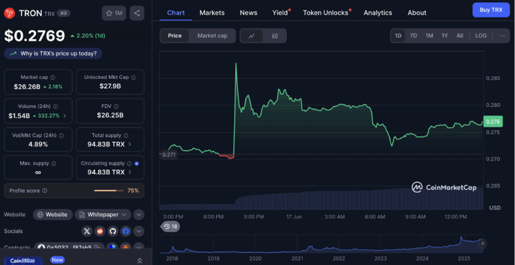 ในขณะที่รายงาน Tron (TRX) มีการซื้อขายกันอยู่ที่ $0.2769 เพิ่มขึ้น 2.20% ในช่วง 24 ชั่วโมงที่ผ่านมา ตามข้อมูลจาก CoinMarketCap